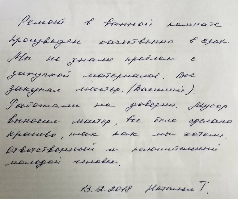 Отзыв только самый лучший! Вот уже год вспоминаем Вас с благодарностью! Хочу отметить, что работа очень качественная, высокопрофессиональная. Результат ремонта радует нас не только эстетикой, но и тем, что были решены наши проблемы нерациональной организации пространства. Будем планировать дальнейший ремонт - обязательно обратимся снова!