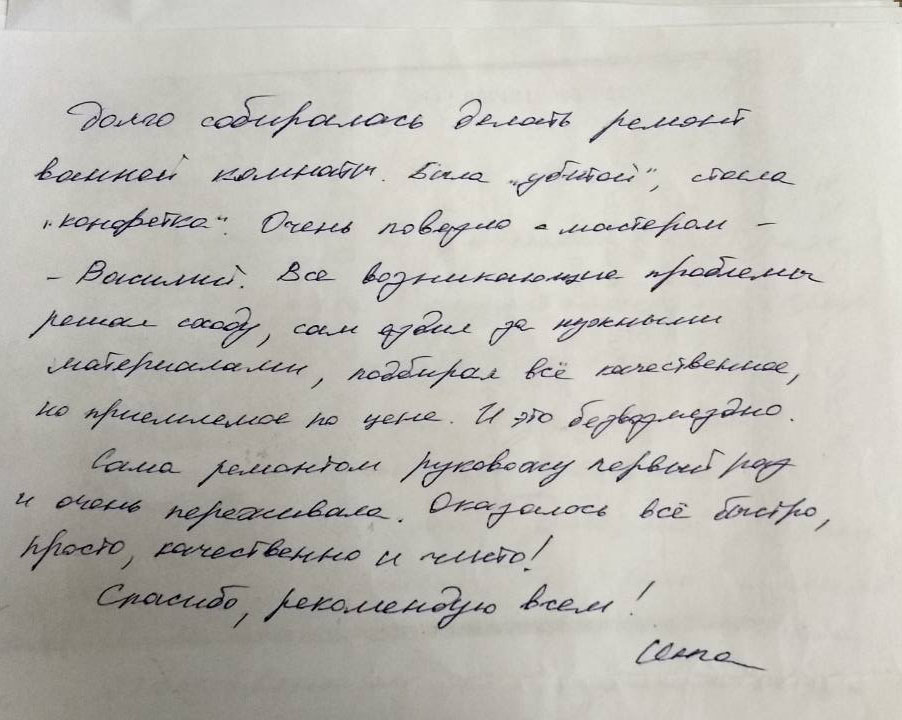 Здравствуйте Василий! Пользуясь случаем хочу ещё раз поблагодарить за проделанную работу. Ремонт в ванной и туалете был сделан качественно и как мне показалось в максимально быстрые сроки. Чуть-чуть непонравилось ожидание в течении двух недель из-за занятости мастера